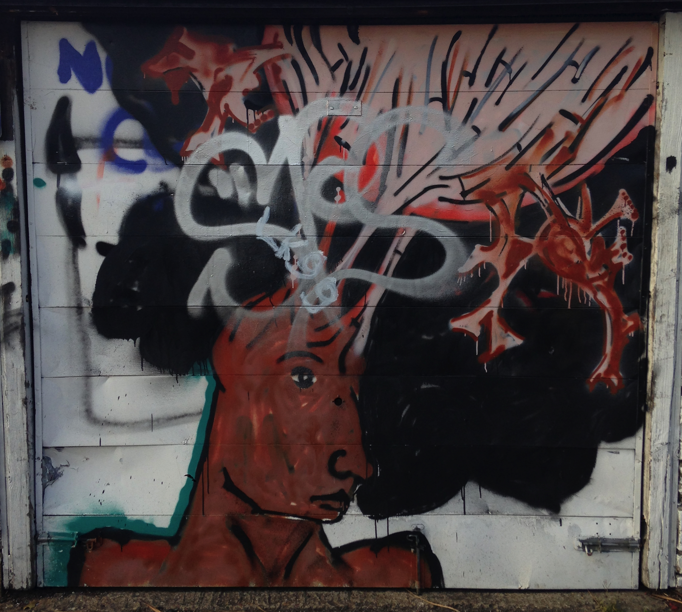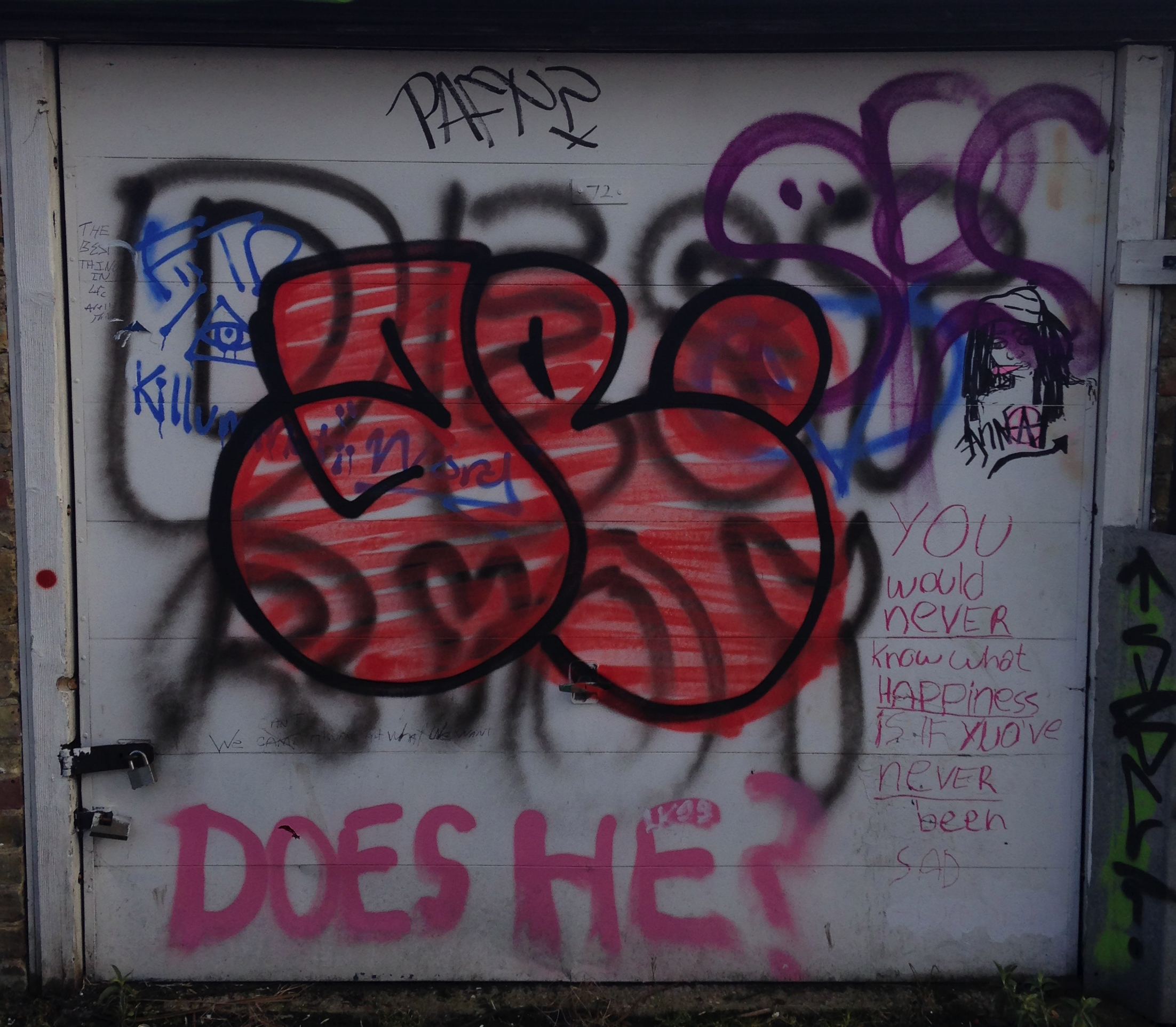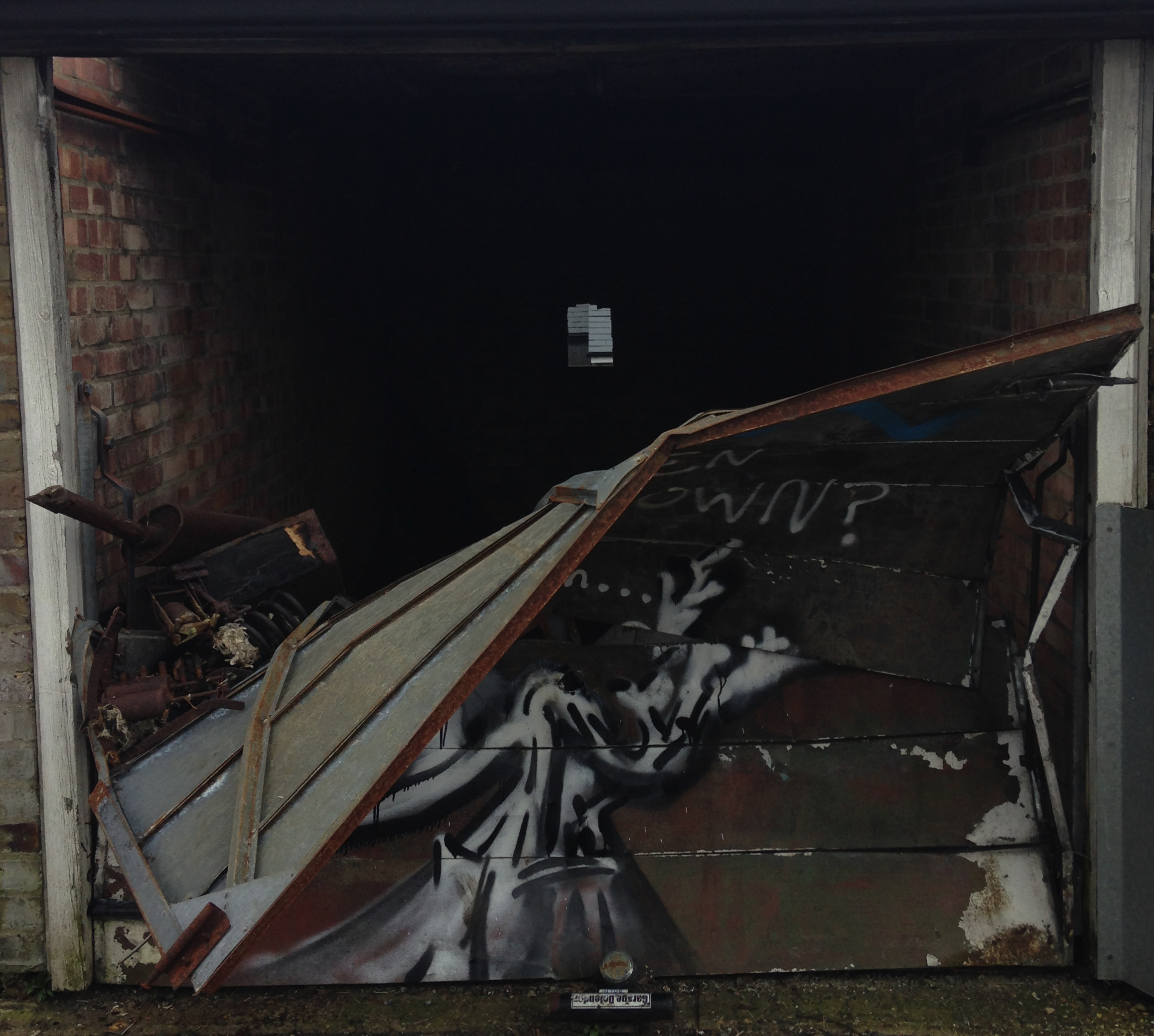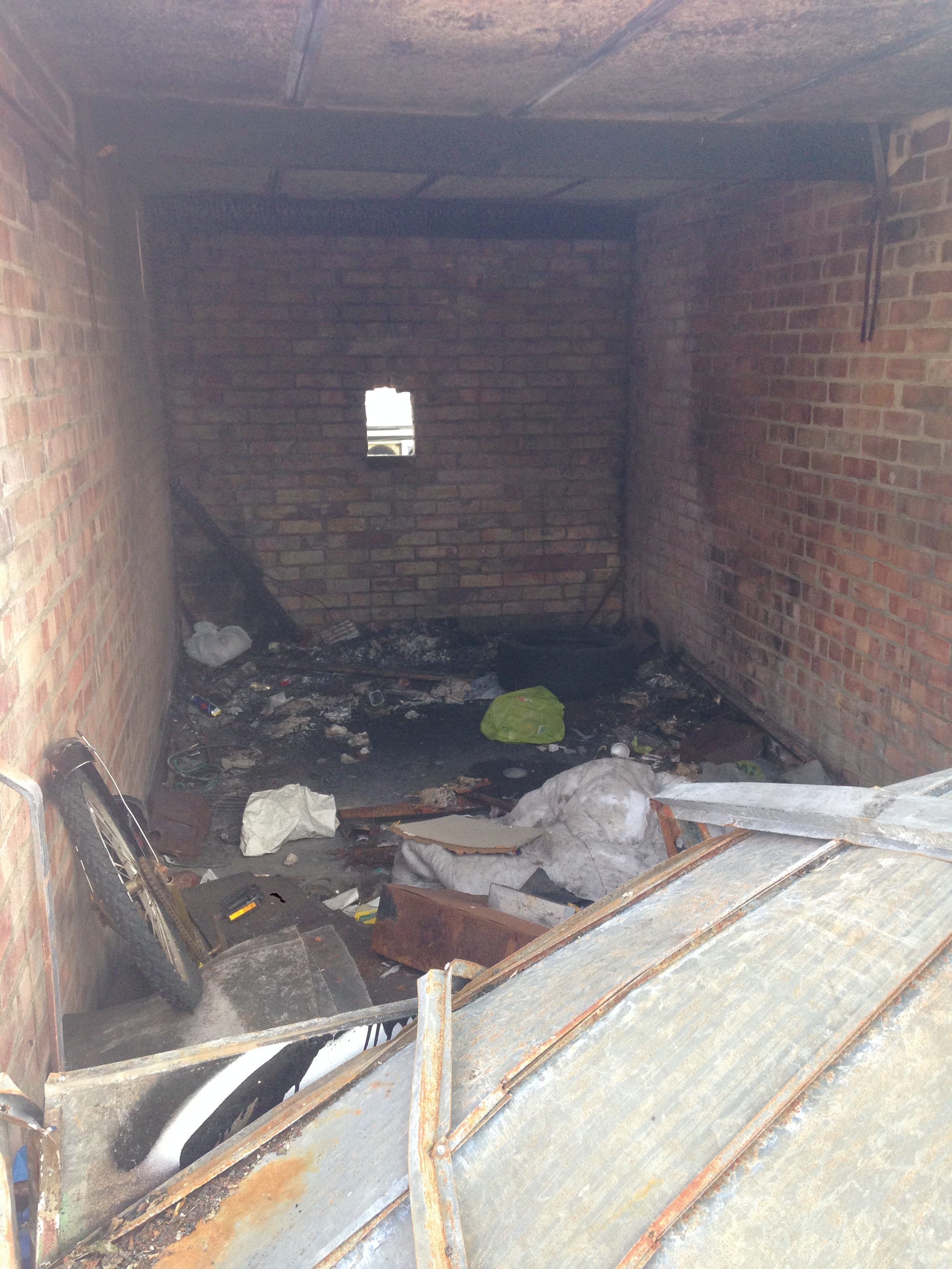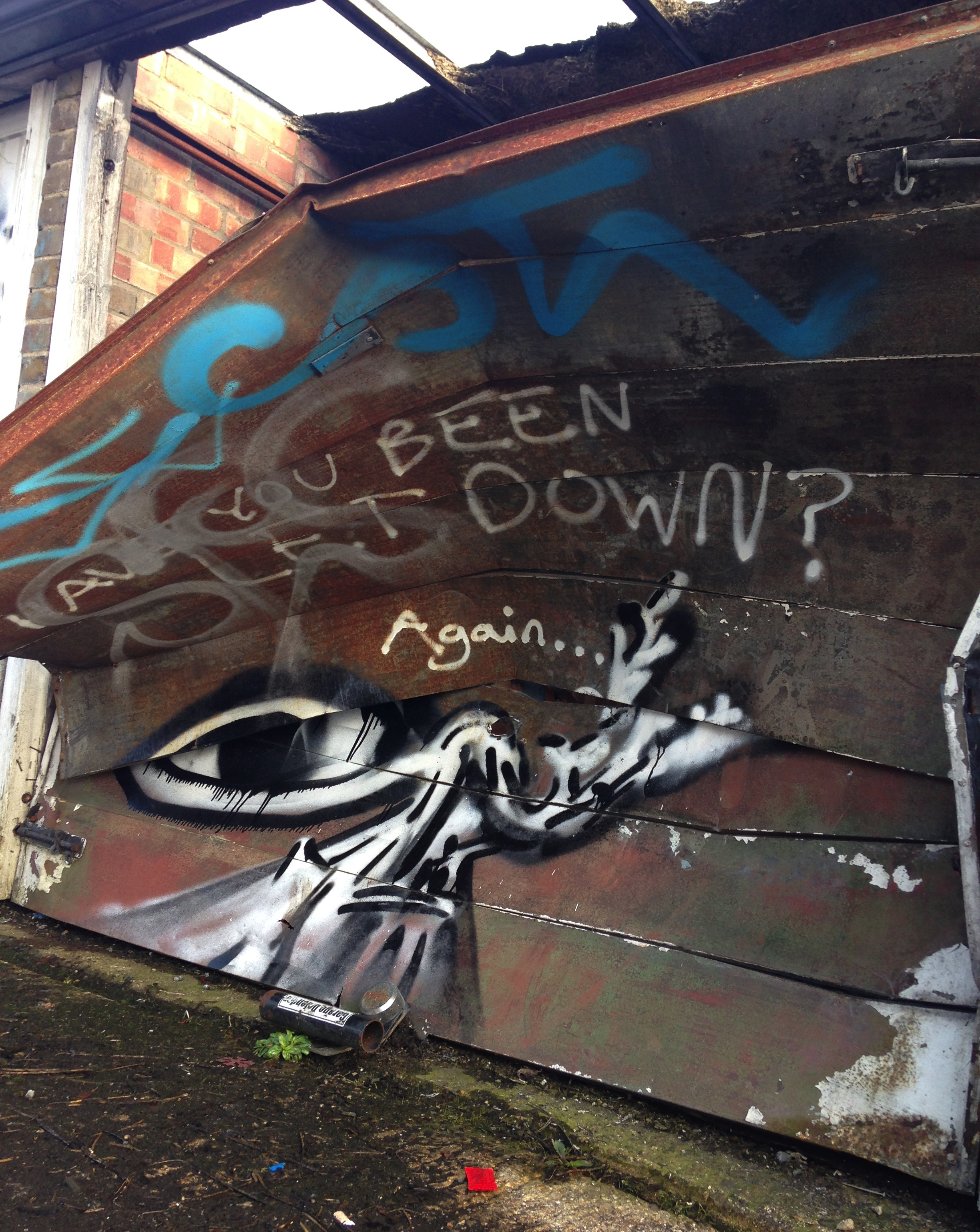 Anyway, having not done anything about the above idea yet, I did take photos of all the garages with the thought of looking at each door piece and seeing what I think. Would I paint over it or leave it there? I was going to leave post-it note comments on the doors themselves (because, you know, encouragement, constructive criticism, general interest) but haven’t gotten around to it, and since starting this post they have now been demolished to make room for fewer but bigger garages. It didn’t help that the general area was left to fall apart, with some garages burnt out, others having the roof and door ripped off, and even some homeless guys living in a few (you can see the unfortunate evidence of this below).
